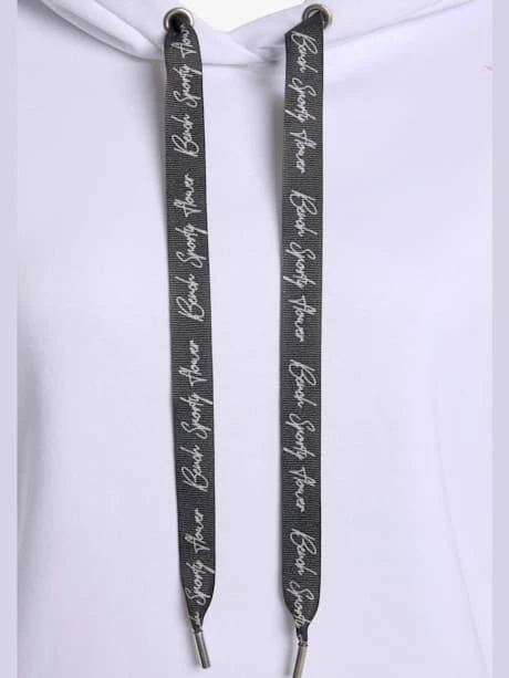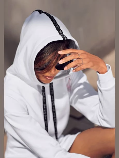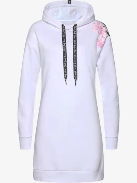 Robe en matière sweat Bench. Capuche à coulisse et liens imprimés. Imprimé floral aux épaules. Bords-côtes extensibles aux manches. 65% coton (Cotton made in Africa), 35% polyester.