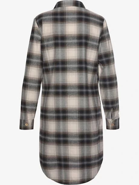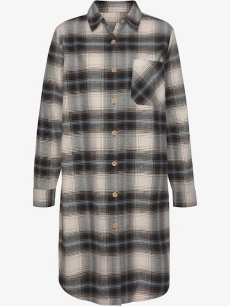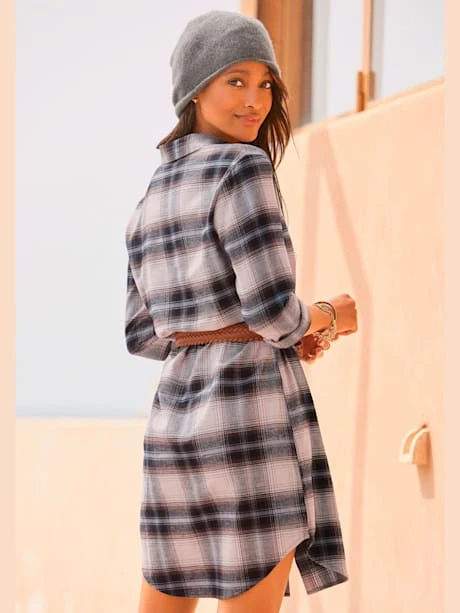 Robe en flanelle Buffalo tendance. Col chemisier. Manches longues avec manchettes. Fermeture : patte de boutonnage devant. Ourlet arrondi. Coupe droite flatteuse. Matière douce légèrement grattée.