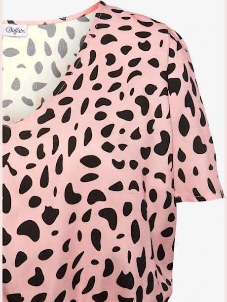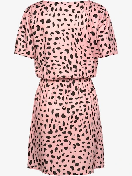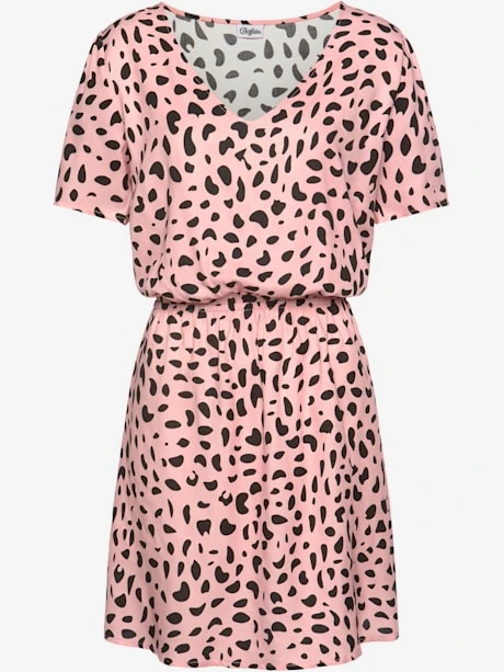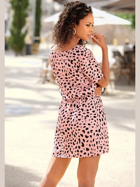 Robe Buffalo. Manches courtes, imprimé animal. Effet de couleur différent pour chaque pièce. Taille élastiquée. Longueur env. 92 cm. Qualité tissée 100% viscose.