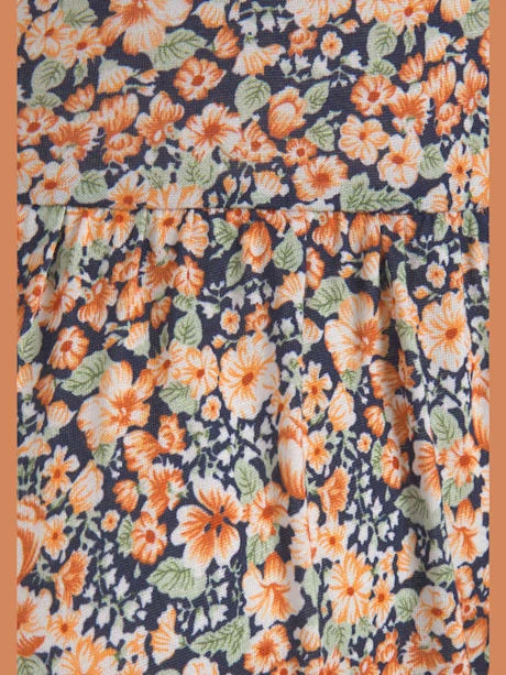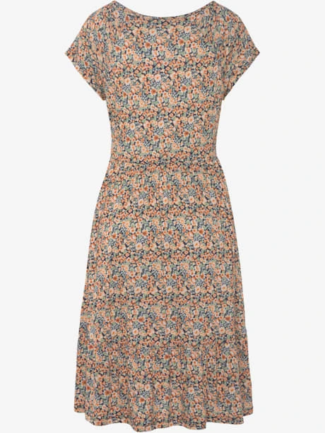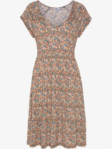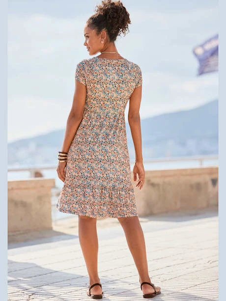Robe Buffalo au joli imprimé floral. Encolure en V, manches courtes et élastique sous poitrine. Partie jupe large à volant. Qualité jersey douce et fluide agréable à porter.