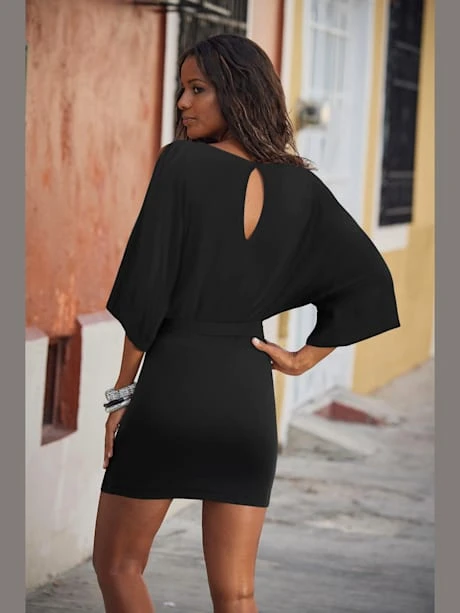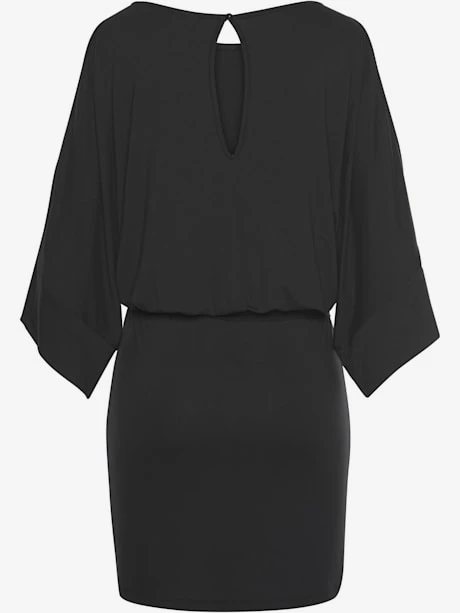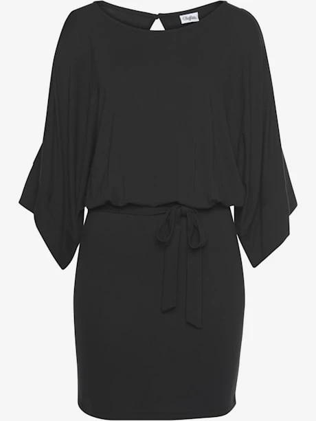 2 imprimés ou noir uni, effet de couleur différent pour chaque pièce. Haut au tombé fluide avec larges manches 3/4 fendues. Fine ceinture au niveau des hanches. Jupe étroite. Longueur jupe env. 42 cm. 95% viscose, 5% élasthanne.