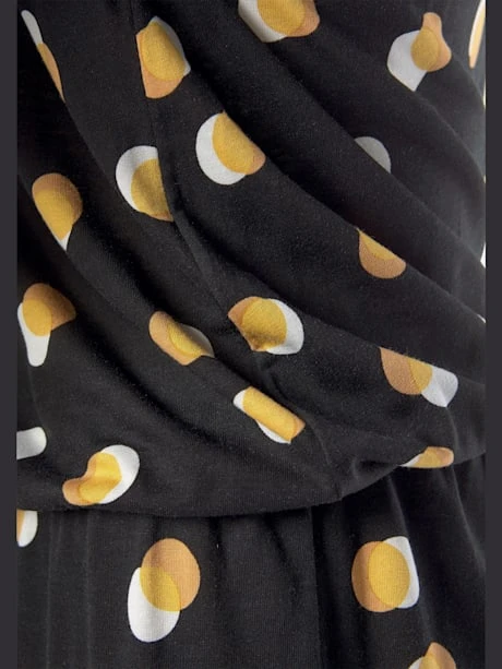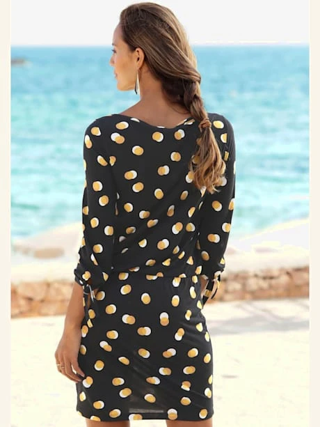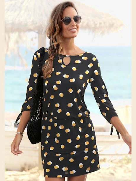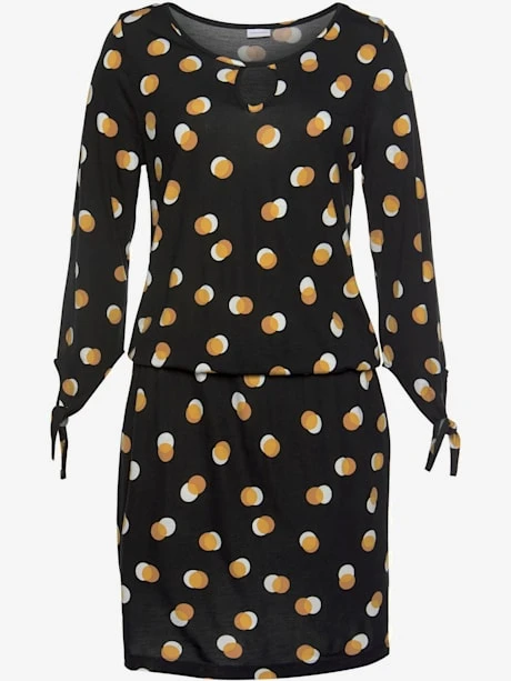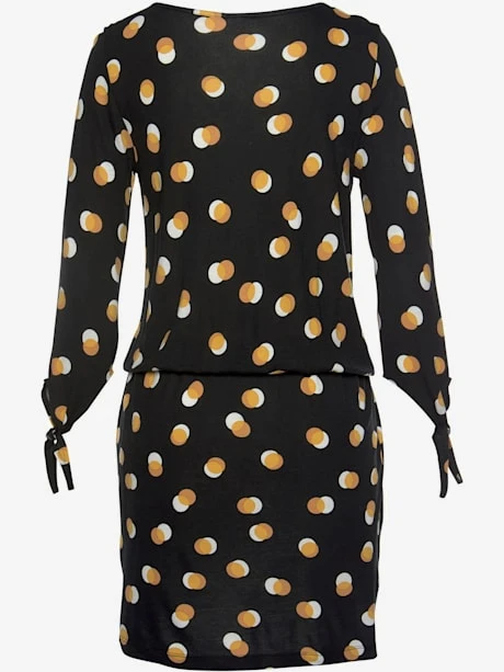Robe à pois Buffalo, effet de couleur différent pour chaque pièce. Encolure ronde avec petite ouverture devant. Manches 3/4 à nouer. Taille élastiquée. Longueur env. 90 cm. 100% viscose.