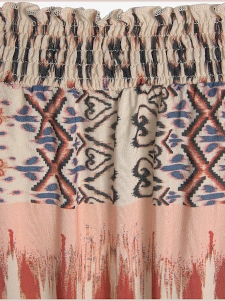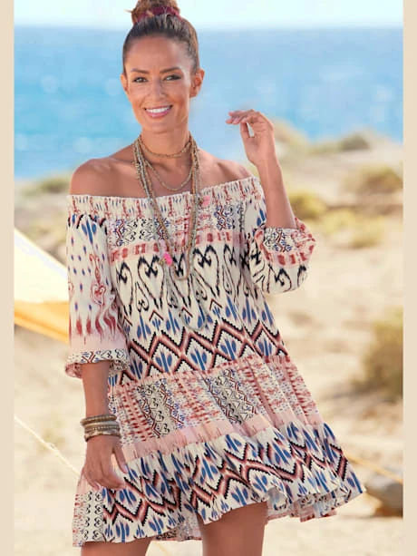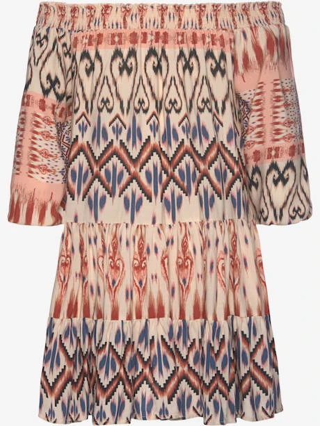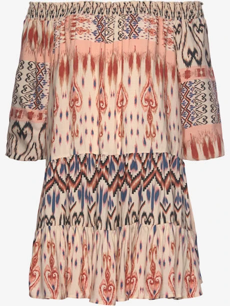 Robe tunique BUFFALO style Carmen, encolure élastique et épaules nues. Manches 3/4. Couture de séparation à la taille. Partie jupe au tombé fluide. Imprimé, effet de couleur différent pour chaque pièce. Longueur milieu du dos env. 72 cm. Tissu durable 100% viscose.