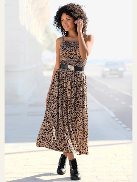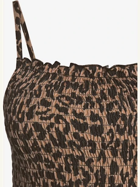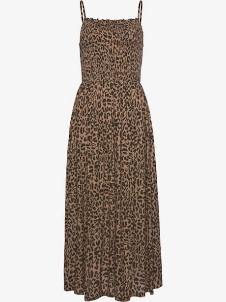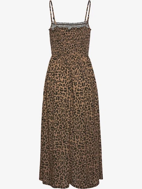 Robe longueur mollet avec imprimé léopard, Robe midi avec bretelles spaghetti réglables., Robe léopard en jersey de viscose doux, Haut smocké, Bords volantés à l’encolure