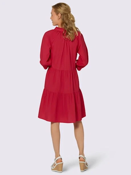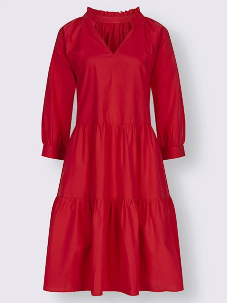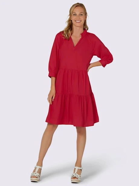 Un poème à tous les niveaux ! Ravissante robe aux propriétés flatteuses. Volants décoratifs à l’encolure ronde avec petit V. 2 fines poches cousues sur les côtés. Manches raglan 3/4 à manchettes.