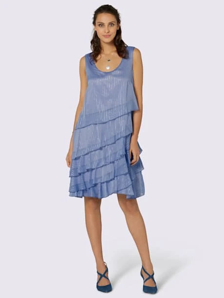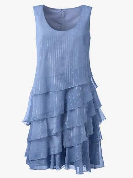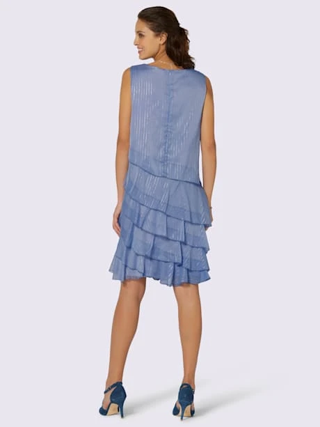 Si cette robe attire tous les regards, c’est grâce à sa combinaison de volants en biais et de fines rayures brillantes ! Glissière invisible au dos. Entièrement doublée et opaque.