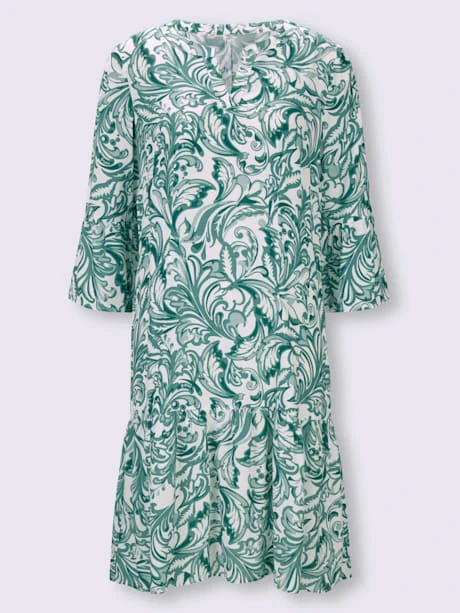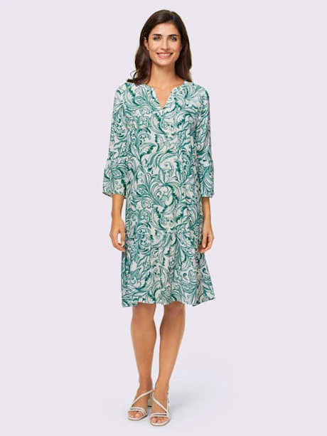 Robe à imprimé floral très tendance et volants aux manches 3/4. Coupe cintrée avec pinces poitrine, encolure en V et glissière latérale. Fronces aux coutures de séparation.