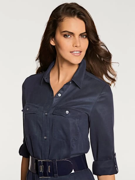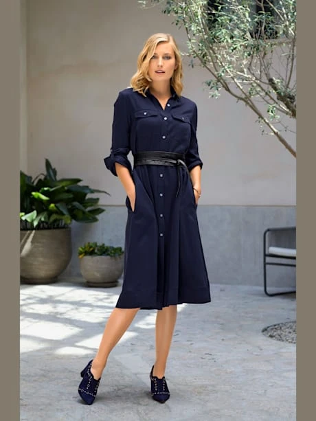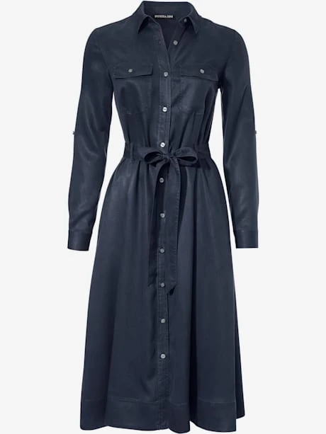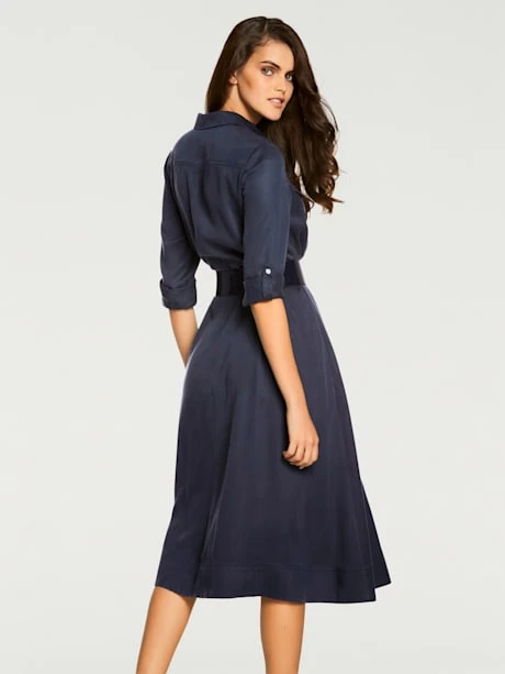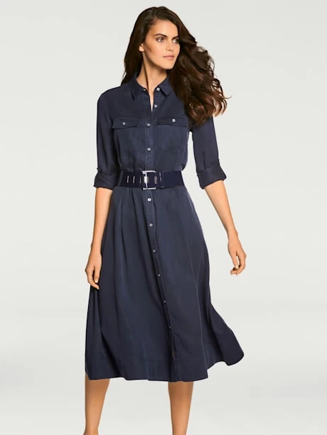 Robe-chemisier avec ceinture à nouer. Tombé fluide, toucher frais, peu froissable. Haut moulant, partie jupe évasée. Pour le quotidien et le bureau. Manches retroussables, à fixer avec bride.