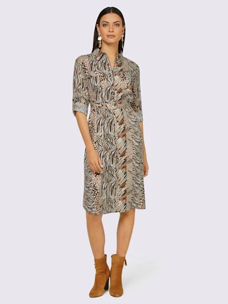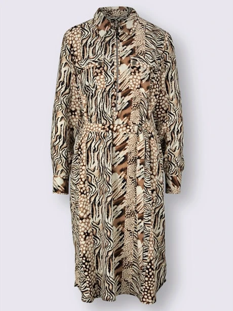Robe décontractée avec un mélange de magnifiques motifs animaux en fourrure sur un tissu chemisier doux et fluide. Réglable en largeur grâce à la ceinture assortie ou à l’une de vos propres ceintures. Col chemise élégant avec glissière jusqu’aux hanches. 2 poches poitrine à rabat et fermeture à bouton. Boutons-pression décoratifs sur les manches longues retroussables au 3/4. Empiècements au dos et fentes latérales à l’ourlet. Particulièrement agréable à porter grâce aux propriétés thermorégulatrices.