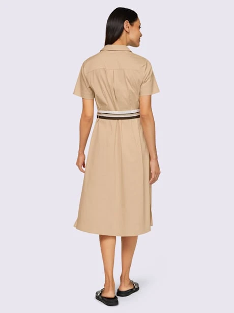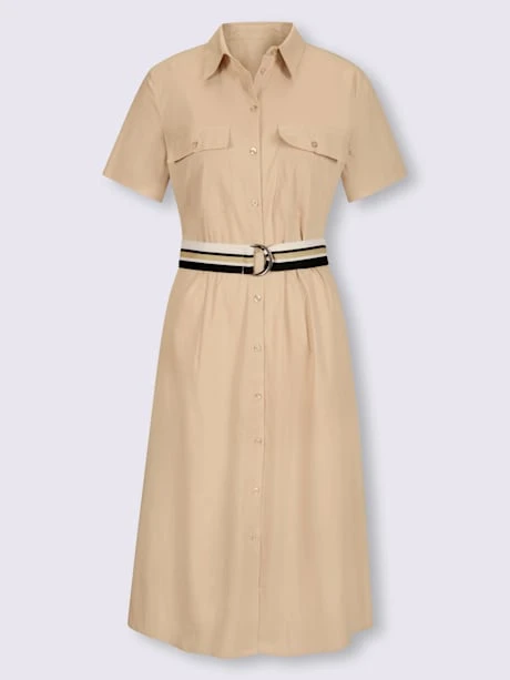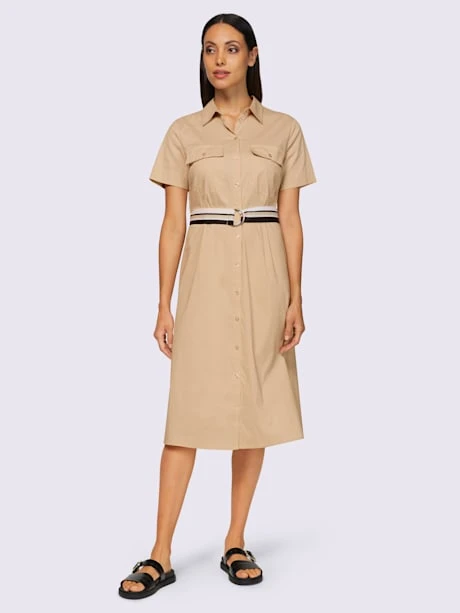 Robe-chemisier classique avec patte de boutonnage sur toute la longueur et ceinture à nouer. Coupe évasée affinante avec poches poitrine et petites fentes latérales. Manches courtes. Soutient l’initiative « Cotton made in Africa ».