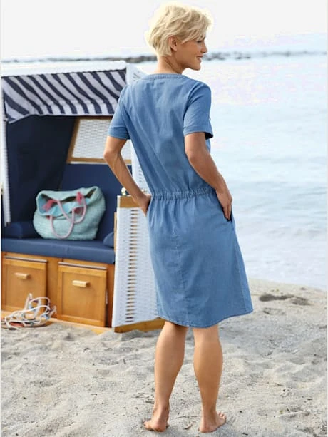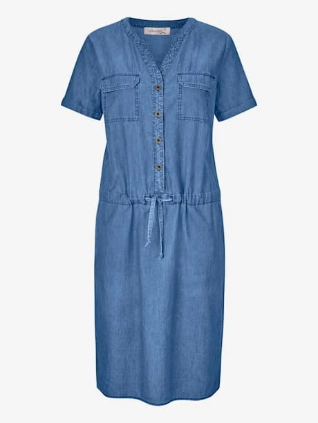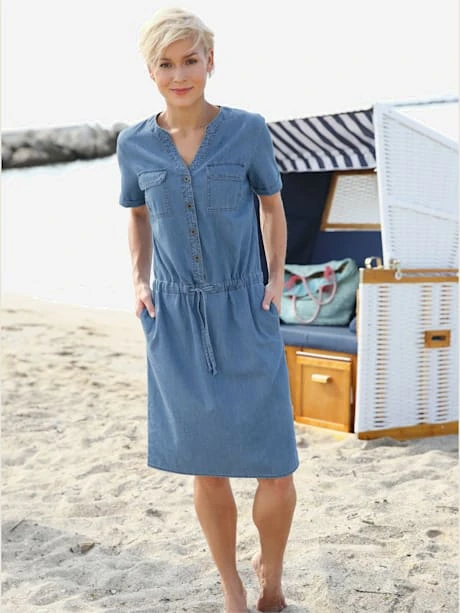 Un incontournable pour un été sportif ! Robe légère, encolure ronde avec petit V et boutons métalliques jusqu`aux hanches. Pinces poitrine pour une tenue parfaite. 2 poches à rabat plaquées. Manches courtes à revers fin. Coulisse à la taille pour régler la largeur.