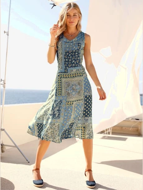 Jolie robe à panneaux évasée dissimulant le ventre, les hanches, les fesses et les cuisses. Larges bretelles. Coutures de séparation pour une tenue parfaite.