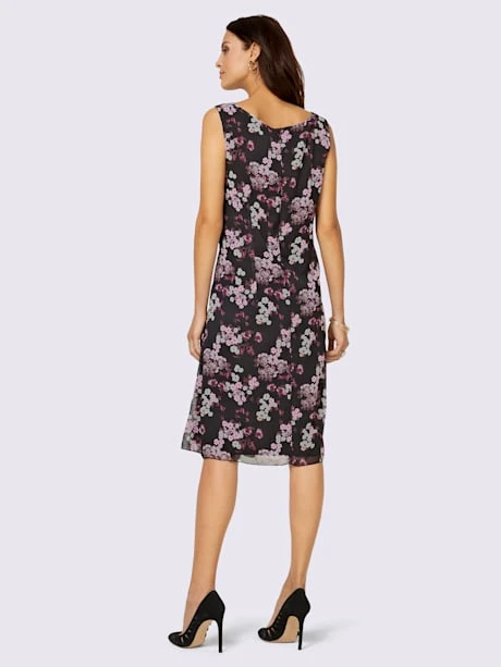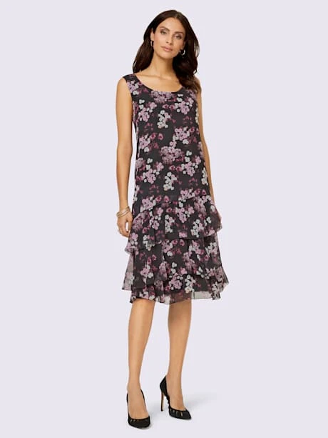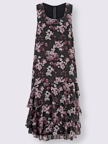 Robe estivale. Très féminine grâce à ses volants. Motif floral délicat pour une touche romantique ! Sans manches, pinces poitrine et glissière au dos jusqu’aux hanches. Qualité peu froissable facile à entretenir.