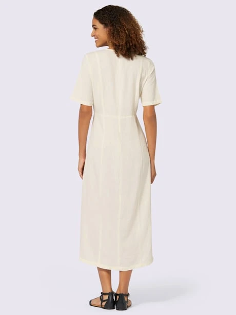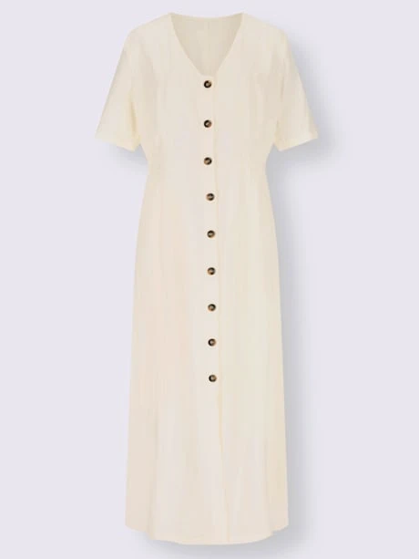 Très flatteur ! Robe en mélange de viscose et de lin de qualité, idéale pour l’été. Encolure en V flatteuse, coutures de séparation et patte de boutonnage sur toute la longueur avec boutons imitation corne. Manches courtes.
