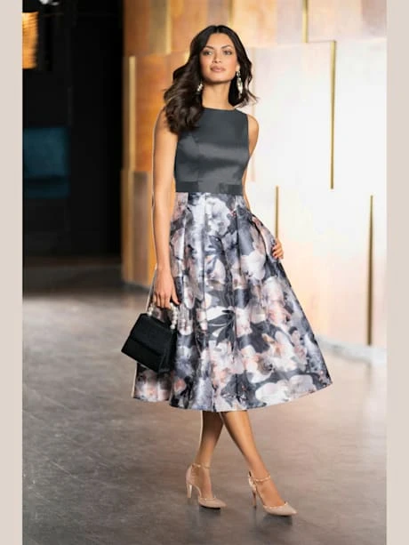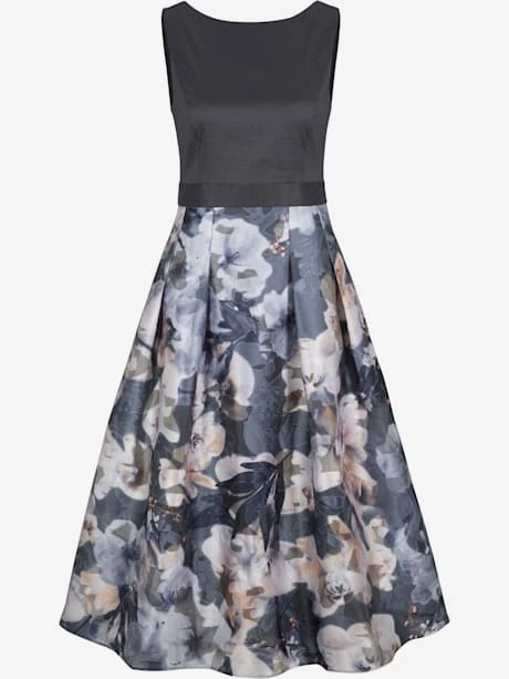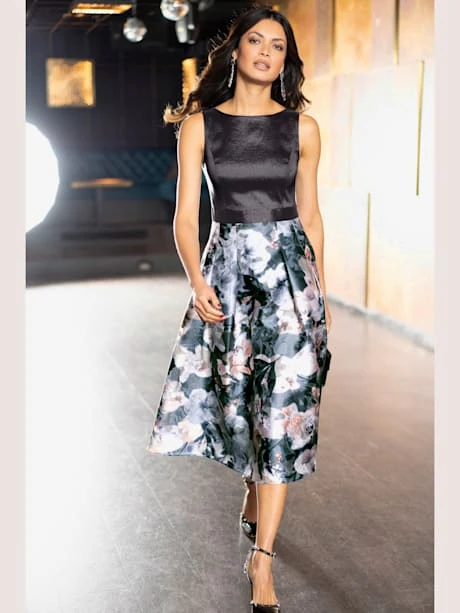 Robe de cocktail pour une silhouette féminine ! Haut ajusté à l’aspect légèrement brillant, combiné à une partie jupe évasée en qualité vaporeuse imprimée. Glissière latérale discrète.