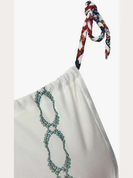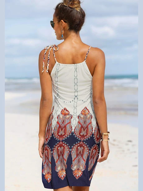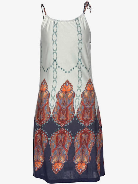 Imprimé, effet de couleur différent pour chaque pièce. Encolure froncée avec bretelles tressées, à nouer sur une épaule. Longueur au milieu du dos env. 84 cm. 100% viscose.