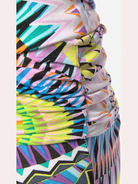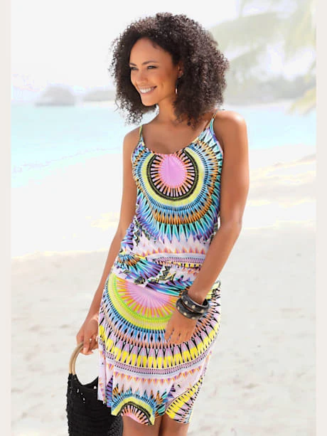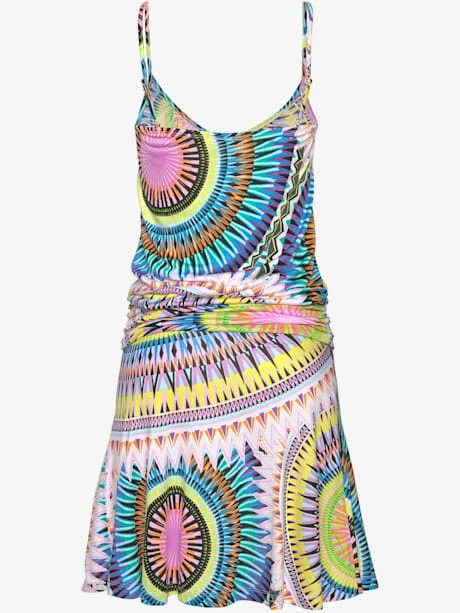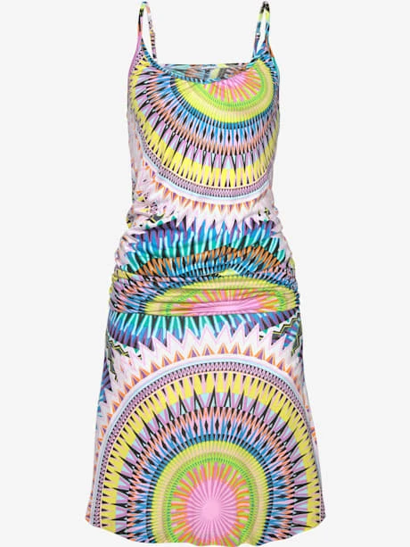 Imprimé, effet de couleur différent pour chaque pièce. Bretelles spaghetti réglables. Hanches froncées. Longueur jupe env. 38 cm. 100% viscose.