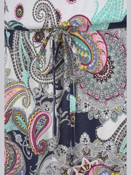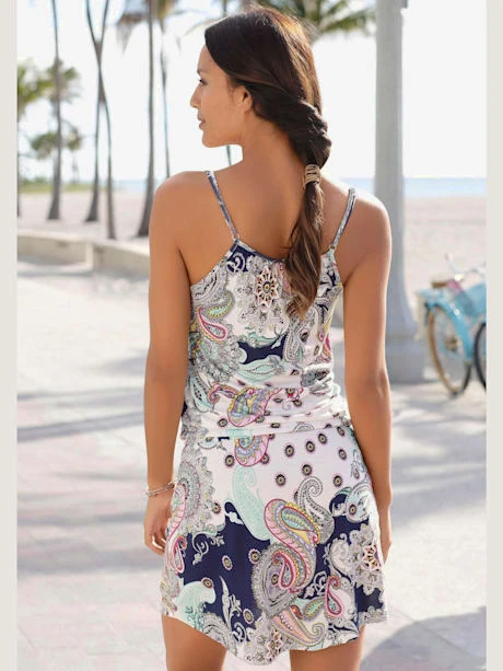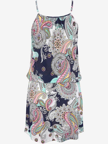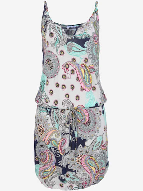 Découpe à l’encolure. Fines bretelles réglables, hanches élastiquées avec cordon. Ourlet arrondi. Imprimé, effet de couleur différent pour chaque pièce. Longueur jupe env. 40 cm. Qualité fluide et douce 100% viscose.
