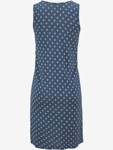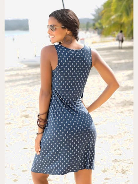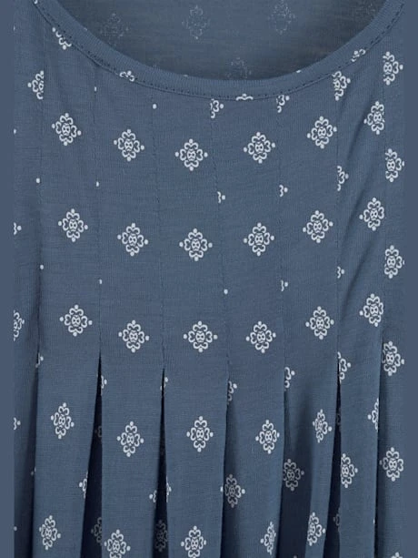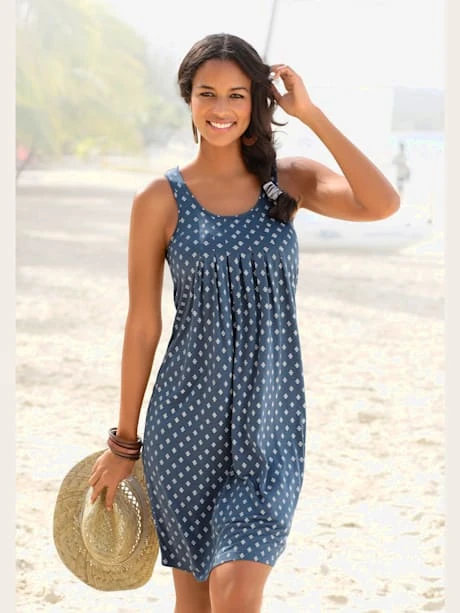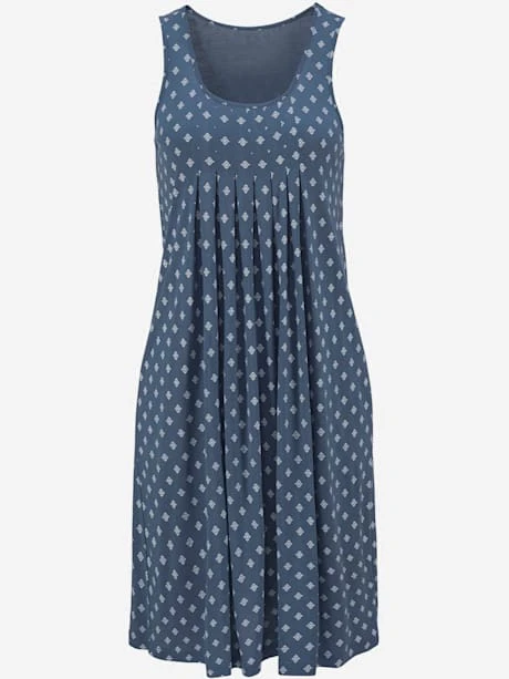 Coupe à bretelles avec plis sous la poitrine et jolis motifs imprimés sur la partie jupe. Qualité douce et fluide. Longueur env. 90 cm. 100% viscose.