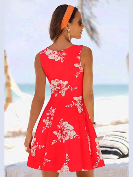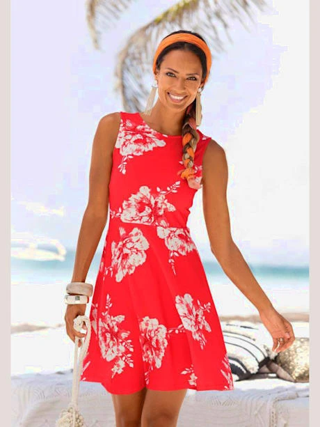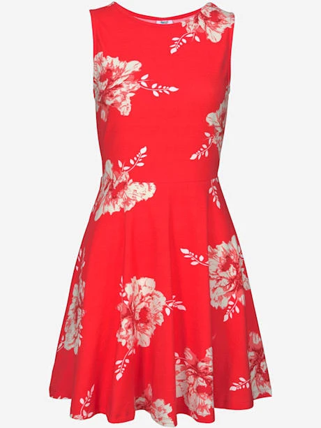Robe d’été imprimé floral. Coupe sans manches avec encolure ronde. Partie jupe légèrement évasée. Longueur env. 88 cm. Matière douce 95% coton (Cotton made in Africa), 5% élasthanne.