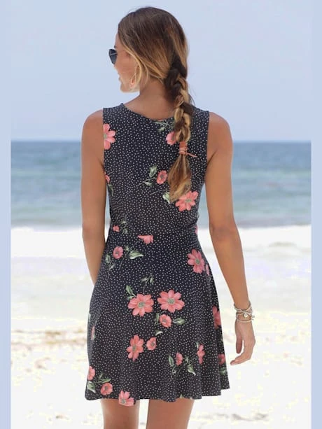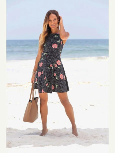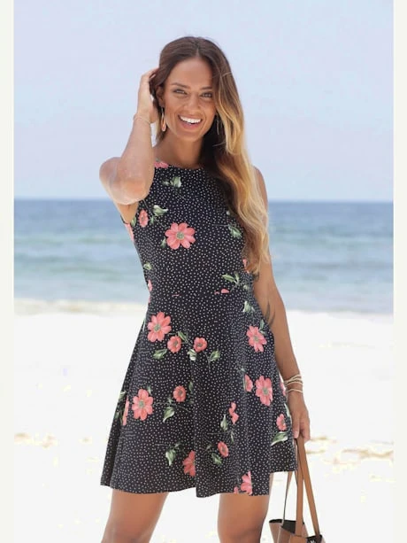 Robe de plage Beachtime avec larges bretelles débardeur. Jolie encolure ronde devant. Coupe normale au dos. Partie jupe légèrement évasée. Imprimé, effet de couleur différent pour chaque pièce. Longueur env. 88 cm. 95% coton, 5% élasthanne.