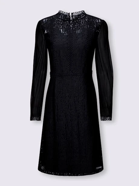 Élégante robe en dentelle de qualité. Doublure opaque. Col montant tendance et manches légèrement transparentes en qualité plissée. Glissière discrète et bouton au dos.