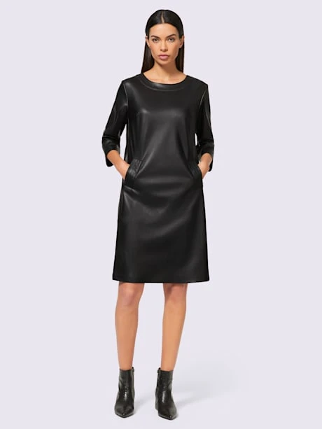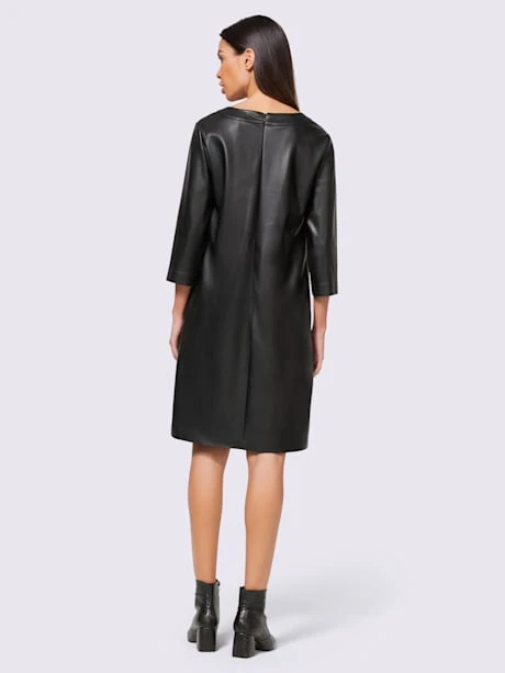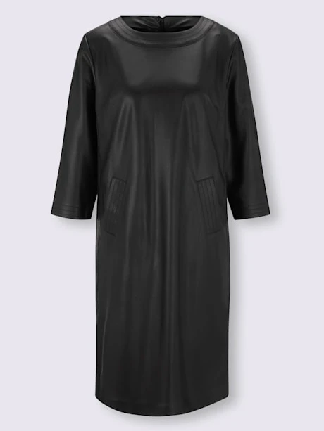 Robe en synthétique légèrement brillante. Intérieur doux. Superbes piqûres décoratives, manches 3/4, poches latérales fendues et glissière discrète au dos. Revêtement polyuréthane.