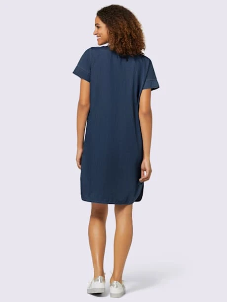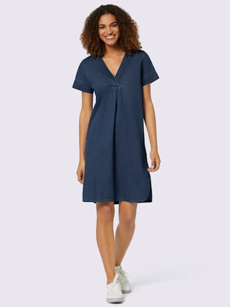 Un véritable modèle affinant : robe imitation denim moderne. Encolure en V rehaussée d’une large bordure ornée de jolies nervures. Plis en dessous pour un tombé décontracté. Ourlet arrondi et fentes latérales.