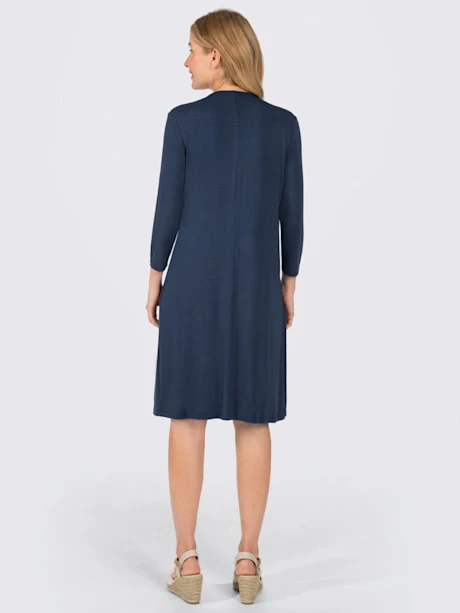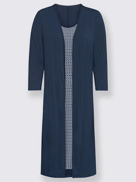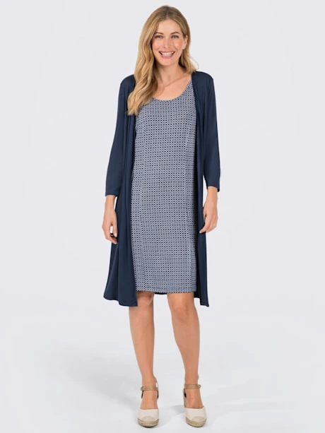 Qualité douce et fluide, motif imprimé tendance et aspect 2 en 1 flatteur : cette robe en jersey satisfait tous les désirs ! Robe joliment imprimée avec encolure ronde passepoilée. Partie veste fixe unie, coupe longue, ouverte et flatteuse avec manches 7/8 tendance.