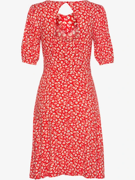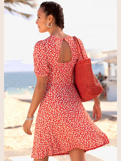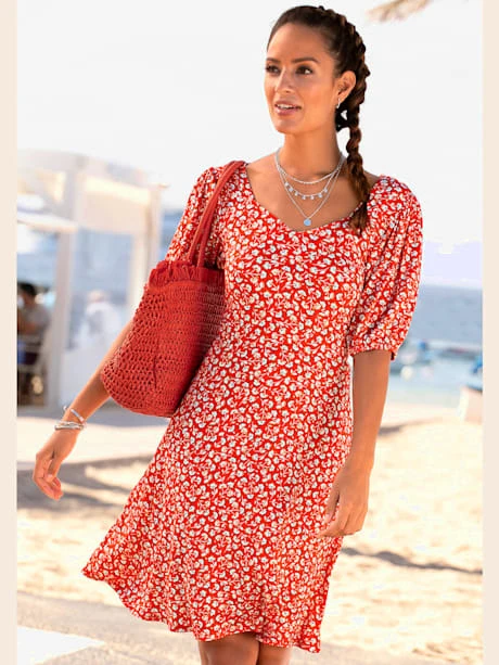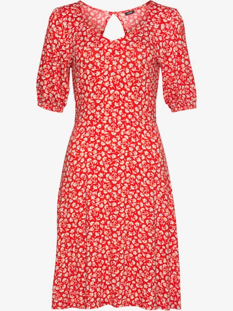 Robe VIVANCE, imprimé floral. Effet de couleur différent pour chaque pièce. Ouverture triangulaire au dos, boutons dans le cou. Manches bouffantes élastiquées. Longueur env. 90 cm. Qualité durable 95% viscose, 5% élasthanne.