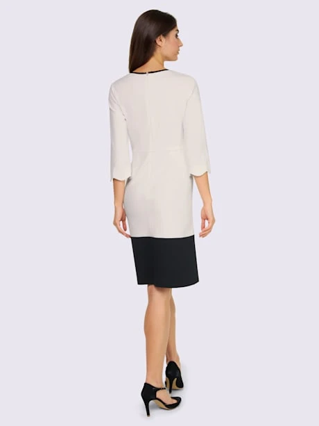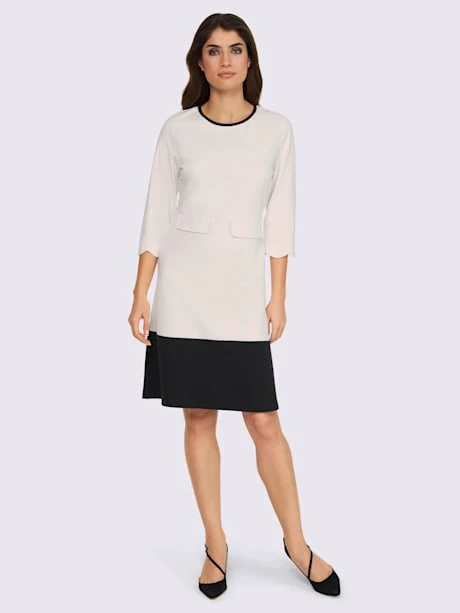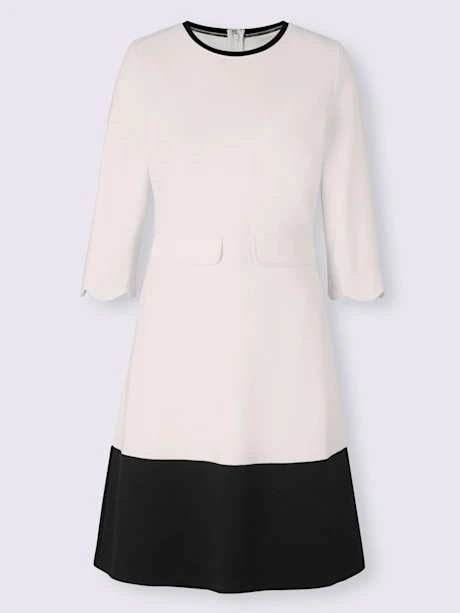 Robe en jersey à la coupe cintrée légèrement évasée, avec encolure ronde et ourlet contrastés. Manches 3/4 avec bords ondulés. 2 fausses poches devant, glissière cousue avec crochet à l’arrière. Tissu fin, fluide et extensible.