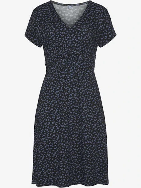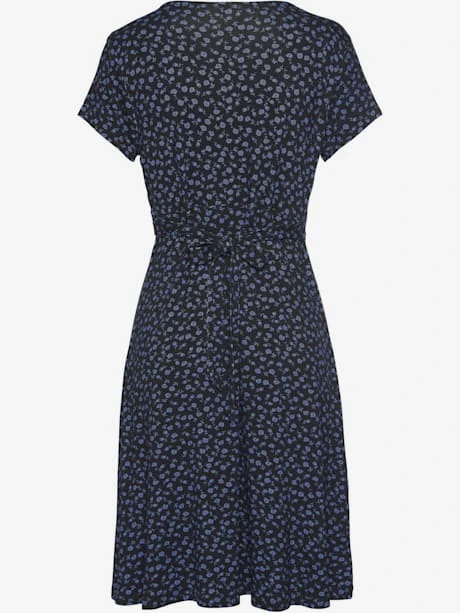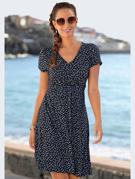Robe VIVANCE imprimée. Effet de couleur différent pour chaque pièce. Encolure en V. Taille froncée, soulignée par un lien à nouer. Partie jupe évasée. Longueur env. 94 cm. Qualité douce, fluide et durable 95% viscose, 5% élasthanne.