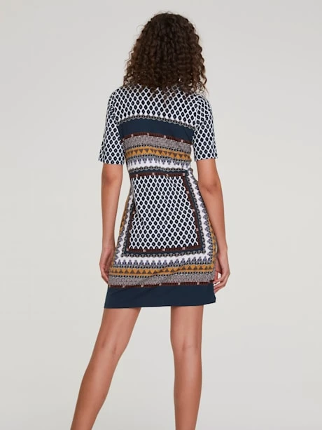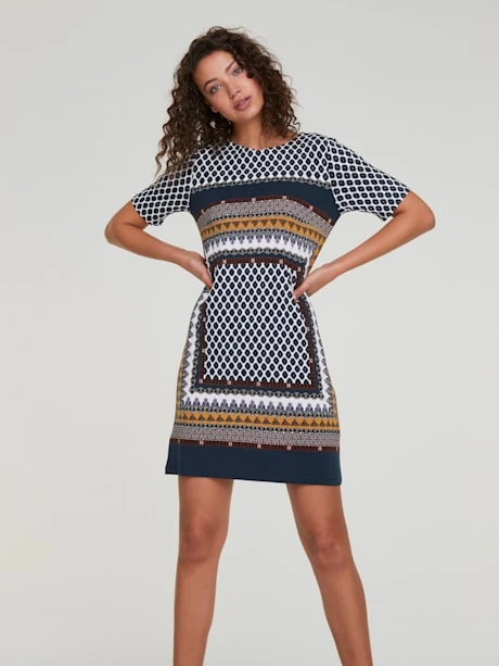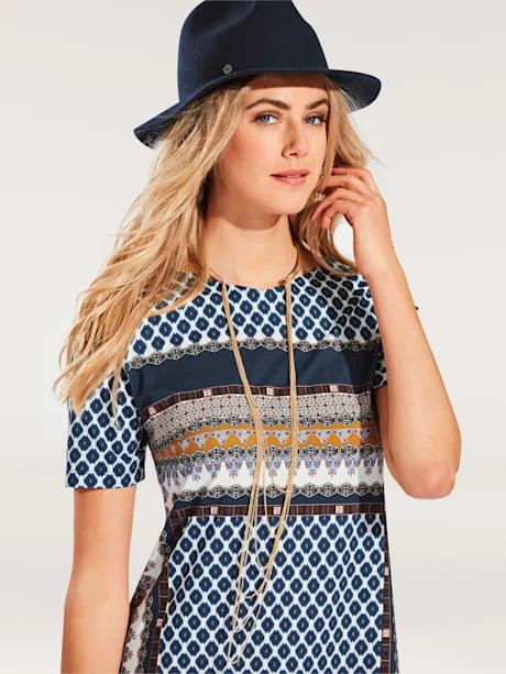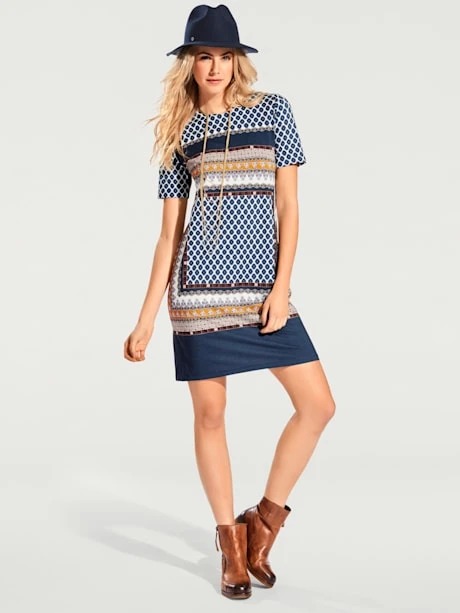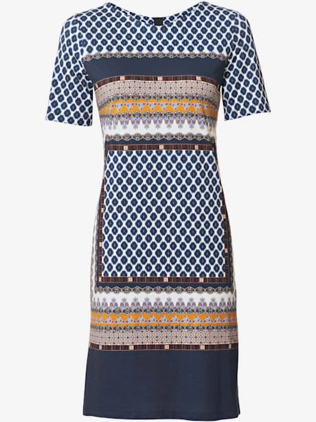 Robe en qualité jersey douce et fluide avec imprimé tendance. Coupe flatteuse avec encolure ronde et manches courtes.