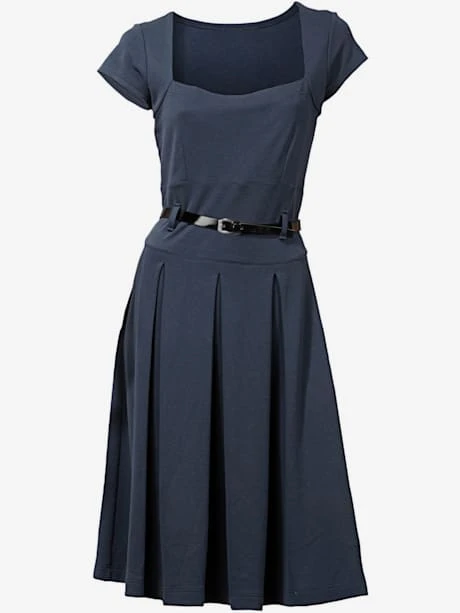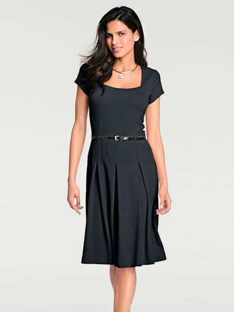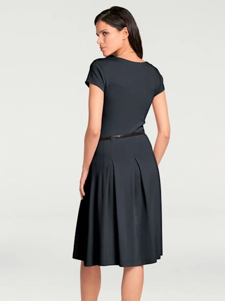 Robe en jersey très féminine avec haut ajusté, encolure carrée flatteuse et manches courtes. Partie jupe évasée avec plis creux et ceinture. Indéformable et tenue parfaite grâce à la qualité viscose mélangée.