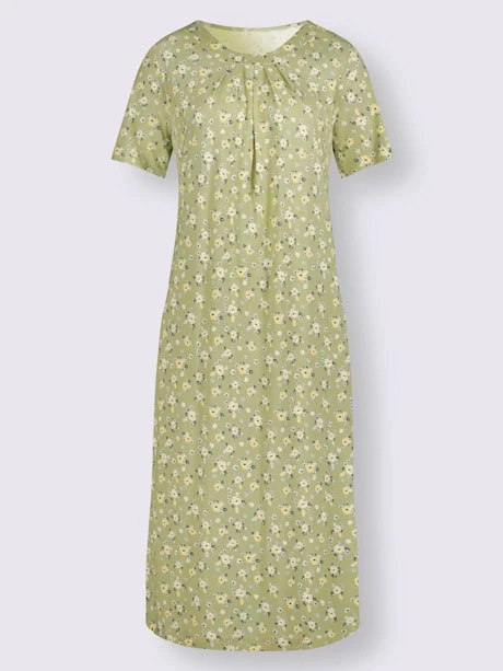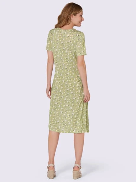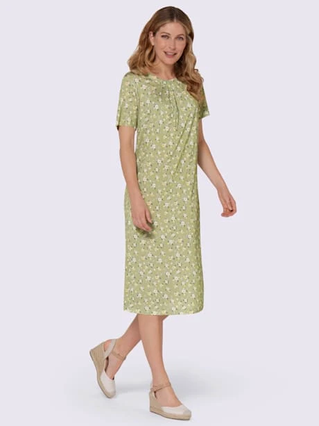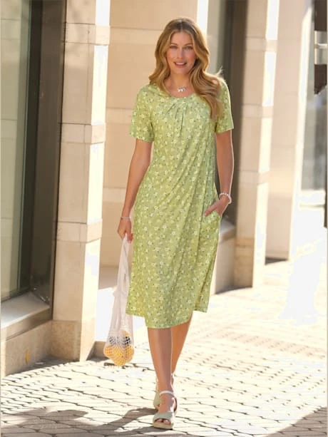 Cette robe en jersey allie un magnifique motif fleuri dans des coloris tendance à une matière souple et avantageusement fluide. La partie plissée à l’encolure ronde avec un large bordure et la coupe évasée flattent joliment la silhouette. Les deux poches latérales sont un détail pratique.
