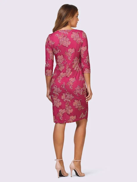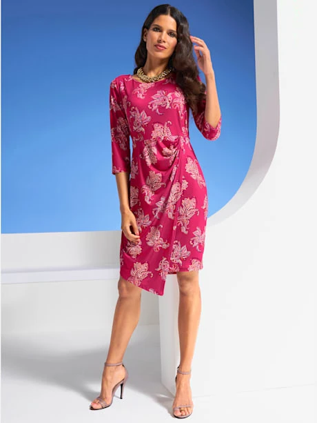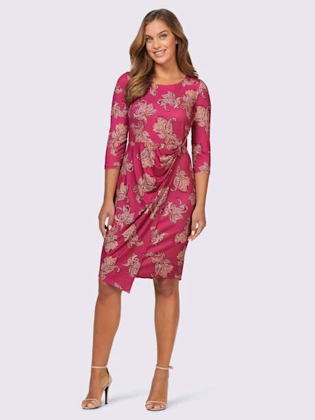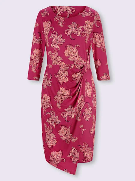 Robe en jersey avec effet cache-cœur flatteur et joli motif paisley ! Manches 3/4, encolure ronde et ourlet en pointe tendance. Petites fronces pour un joli tombé. Extensible et agréable à porter.