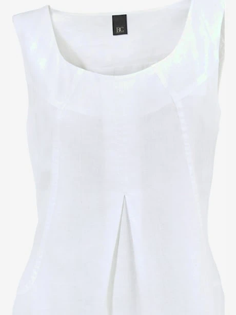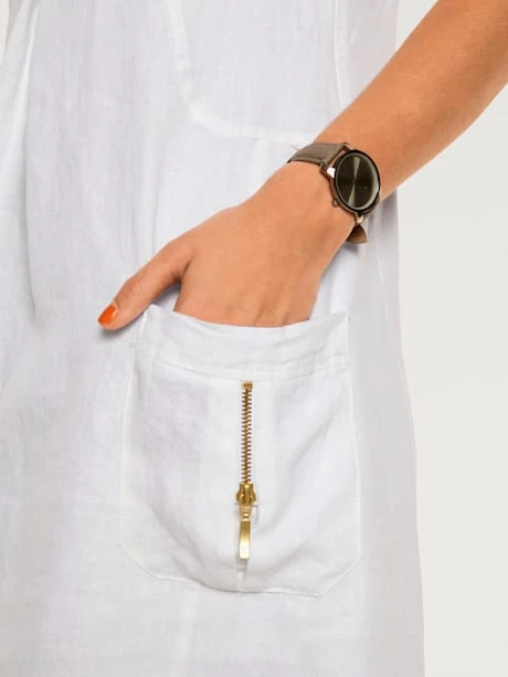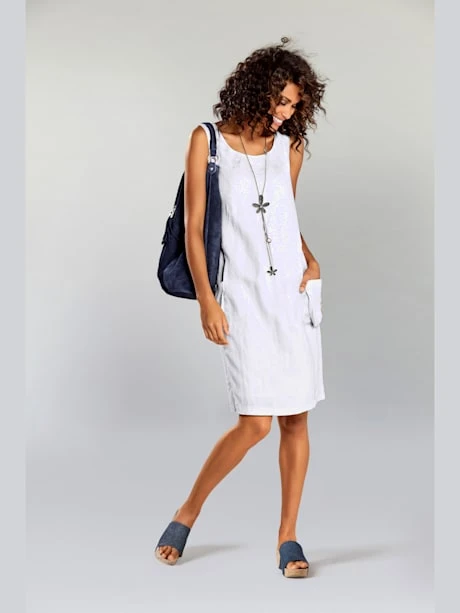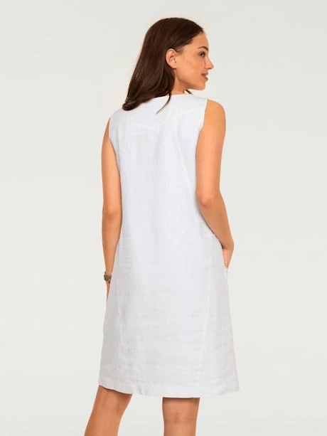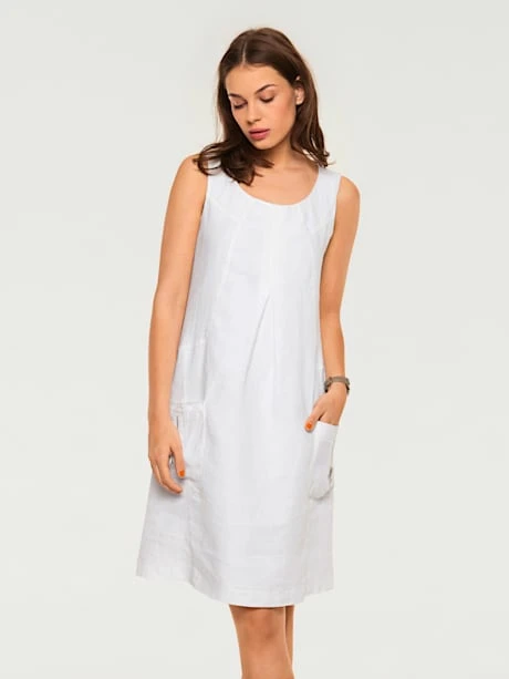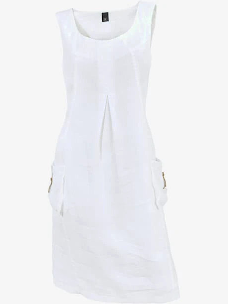 Robe en lin décontractée à la coupe évasée affinante avec plis creux et grandes poches ballons plaquées. Sans manches, encolure arrondie et glissière latérale.