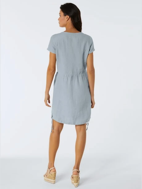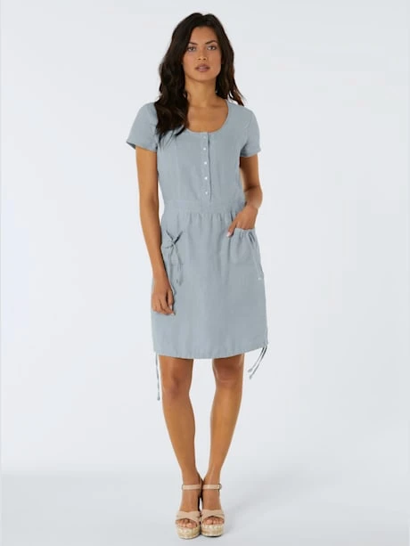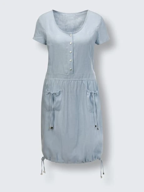Très agréable à porter par temps chaud : robe en lin à la brillance mate. Style décontracté avec large encolure ronde et patte de boutonnage pression jusqu’à la taille. Coulisse et lien à nouer aux 2 poches et à l’ourlet. Taille joliment soulignée par une bordure horizontale et des fronces discrètes, coutures princesse devant et au dos pour une coupe parfaite. Glissière dissimulée dans la couture latérale gauche. Fentes latérales.