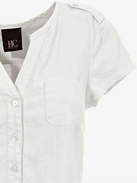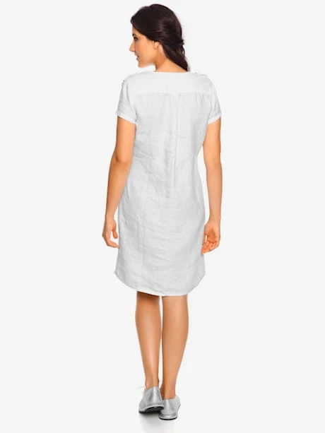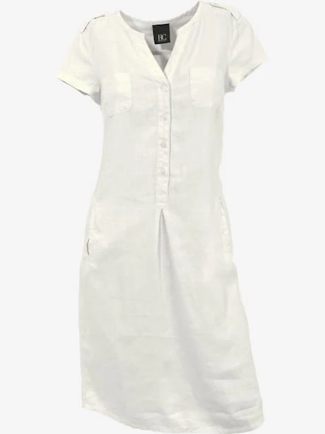 Robe en pur lin facile à assortir et confortable. Encolure ronde, poches et manches courtes. Longueur genou.