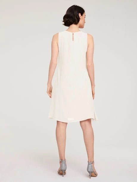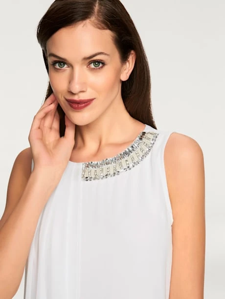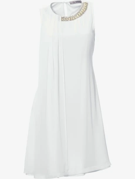 Robe mousseline, application fantaisie à l’encolure. Matière agréable à porter. Un style féminin en toutes occasions. Fermeture boutonnée dans le cou. Longueur env. 94 cm.