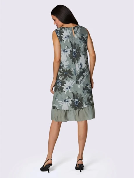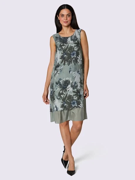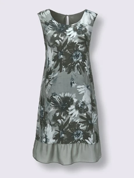 Robe en soie : look superposé flatteur ! Doublé : dessus en qualité mousseline vaporeuse 100% soie, dessous en jersey qualité viscose douce et fluide. Volant transparent à l’ourlet de la doublure. Fente avec fermeture à boutons et boucles boutonnée dans le cou.