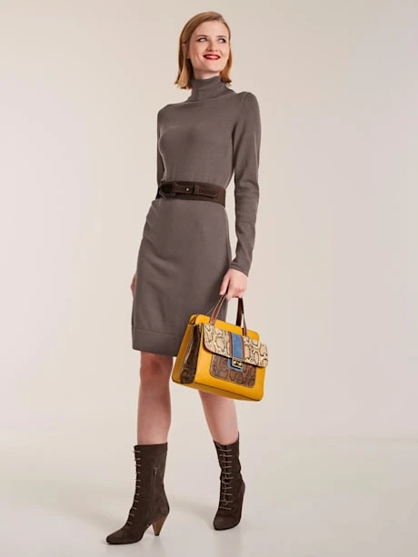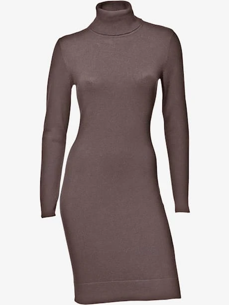 Robe en tricot féminine à manches longues et col roulé. Qualité tricot agréable à porter. Robe longueur genoux et finitions en tricot côtelé. Parfaite pour les belles journées d’automne. Longueur env. 94 cm.