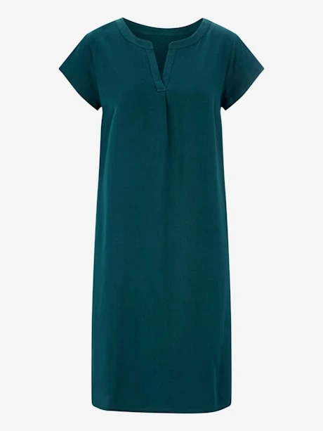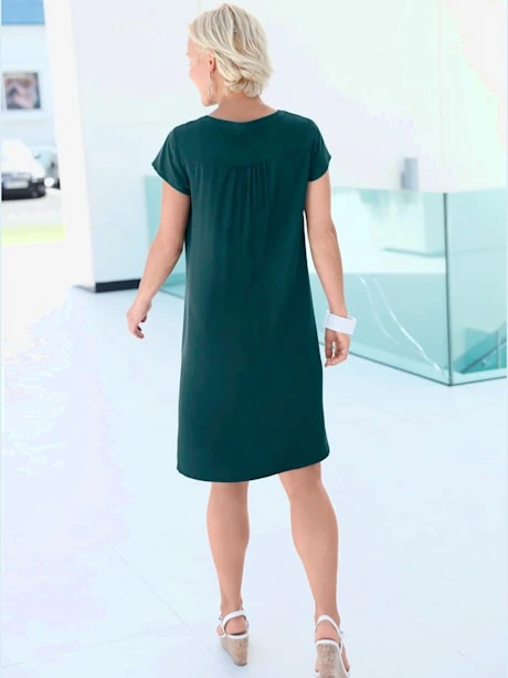 Robe estivale avec pinces poitrines affinantes devant. Belle qualité viscose lisse au joli tombé. Facile à entretenir. Encolure ronde avec petit V.