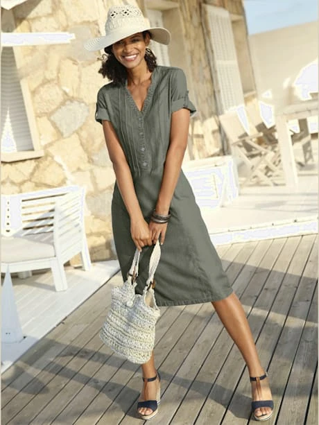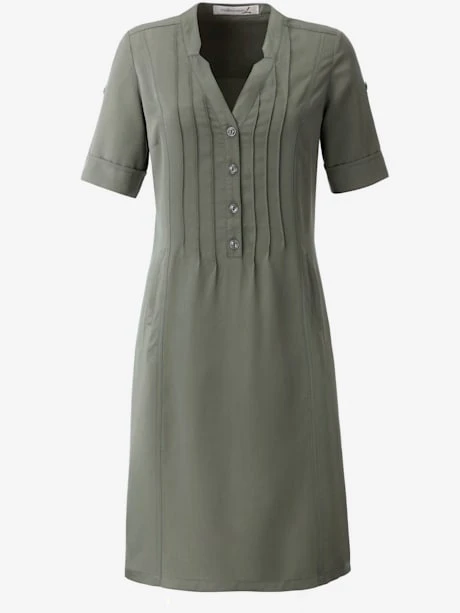 Robe légère de qualité douce et fluide. Avec encolure en V et 2 poches raglan verticales. Patte de boutonnage ornée de nervures. Cordon au dos à la taille pour régler la largeur. Manches retroussables à fixer avec bouton et rabat.