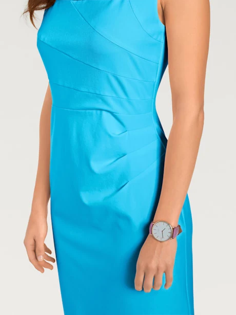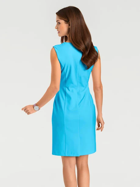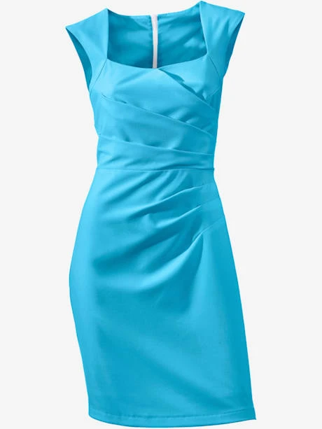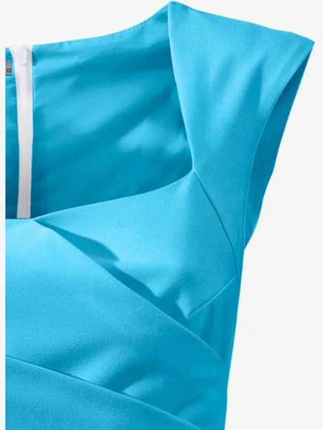 Robe fourreau féminine à la coupe ajustée avec encolure carrée. Sans manches, fente au dos. Glissière discrète.
