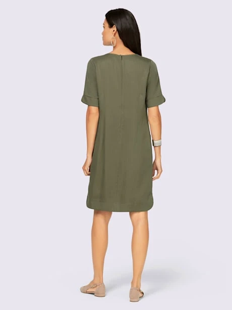Robe en jersey indéformable et de qualité. Découpe en forme de V, œillets et ruban à l’encolure ronde. Glissière au niveau des hanches au dos. Manches courtes affinantes avec bordure et fente. 2 poches plaquées pratiques. Fentes latérales arrondies.
