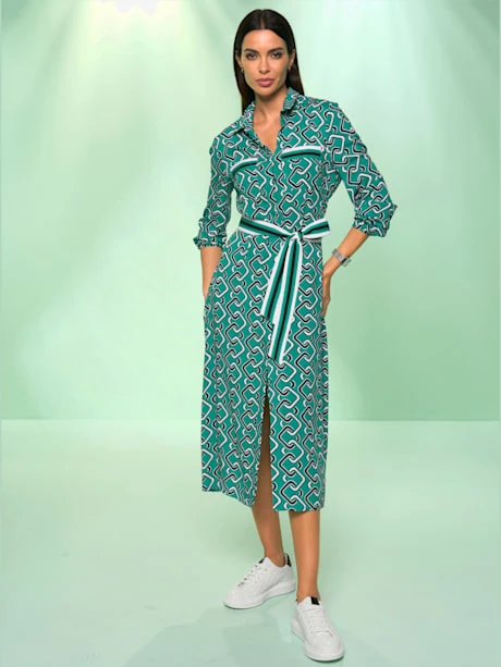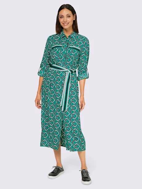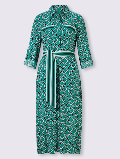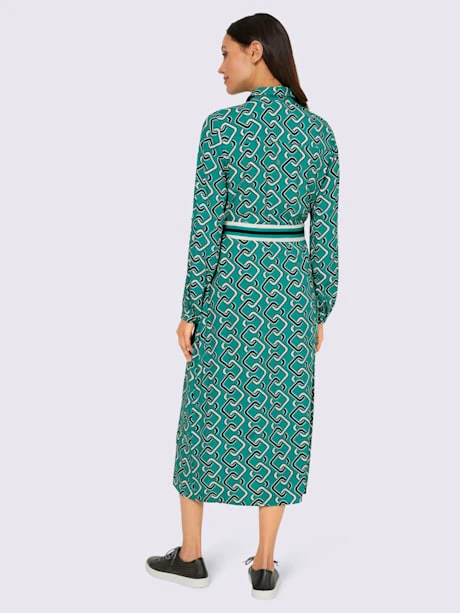 Robe au superbe motif graphique ! Col chemise, patte de boutonnage invisible, poches poitrine plaquées et ceinture à nouer. Manches longues avec manchettes boutonnées étroites et avec bride pour les retrousser. Coupe droite affinante tendance. Pinces poitrine.