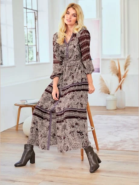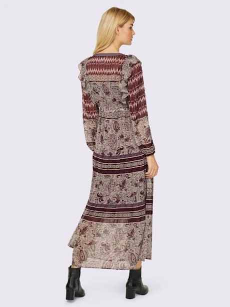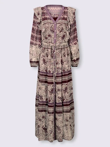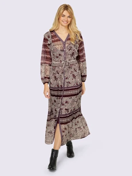 Robe à motifs variés avec superbe imprimé paisley. Tissu du dessus partiellement transparent, fond de robe en jersey et bretelles réglables. Haut orné de volants devant et au dos. Col V et patte de boutonnage sur toute la longueur. Coulisse avec lien à nouer à la taille. Polyester recyclé.