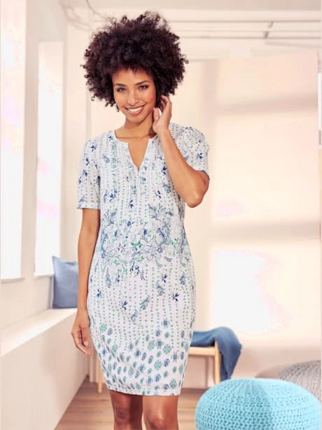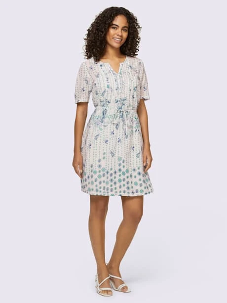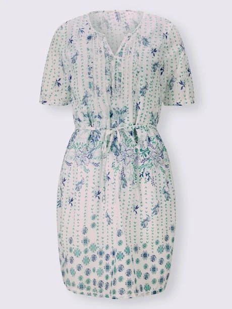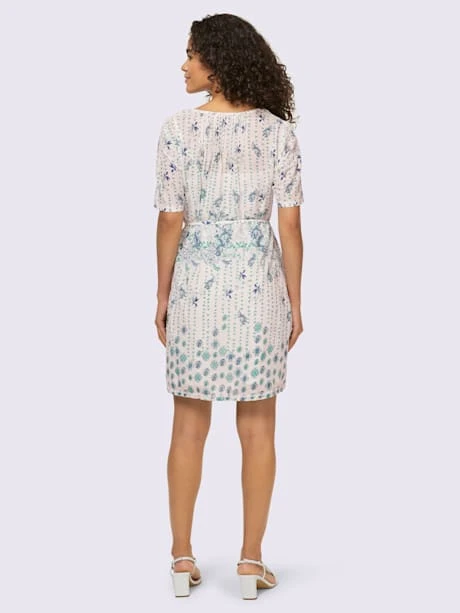 Robe au charmant imprimé floral. Volants féminins et superbe broderie à l’encolure ronde avec V ouvert, manches courtes, patte de boutonnage courte et lien à nouer au dos. Qualité estivale légèrement transparente. Fond de robe.
