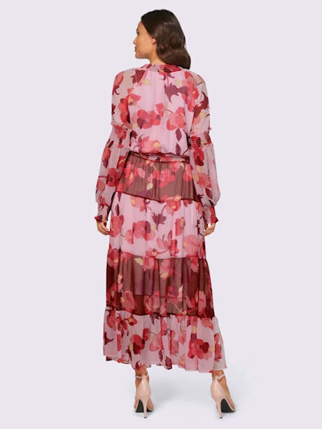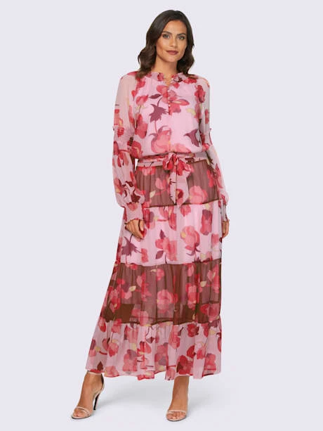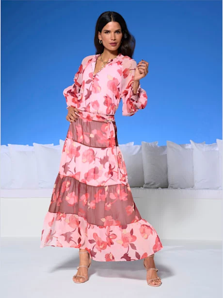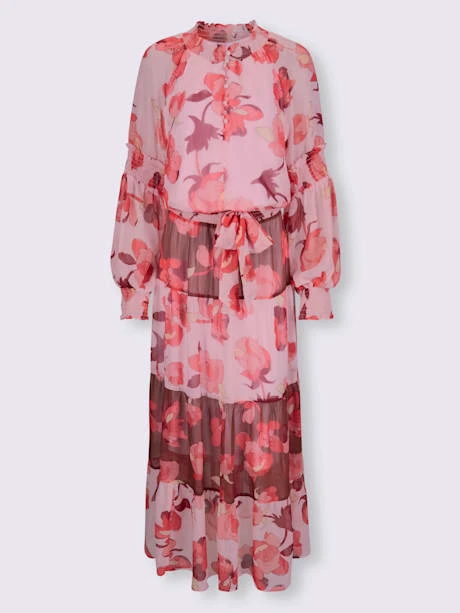 Robe imprimée ultra-tendance avec superbe motif floral et longueur maxi tendance. Haut avec patte de boutonnage courte et empiècements smockés au col montant, aux manches et à la taille. Jupe à volants évasée avec ceinture à nouer. Qualité légèrement transparente en polyester recyclé, doublure jersey agréable à porter.
